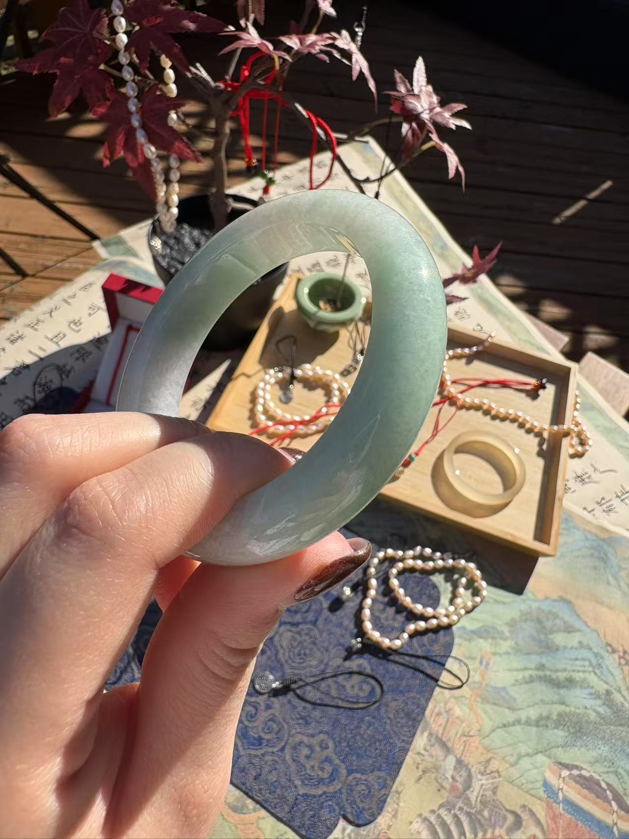A natural Grade A Burmese jade bangle featuring rare spring colors — a harmonious blend of green, lavender, and white. Elegant, vibrant, and full of auspicious meaning.